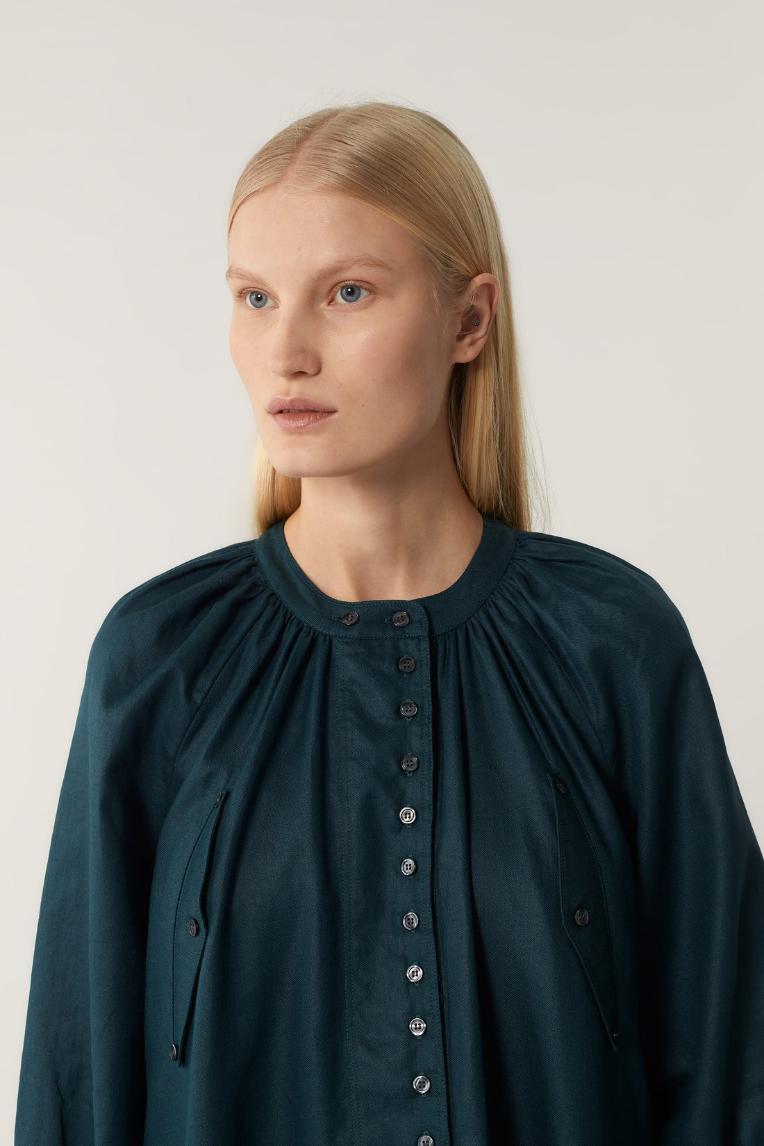- Gathered bottom sleeves and small buttoned cuffs